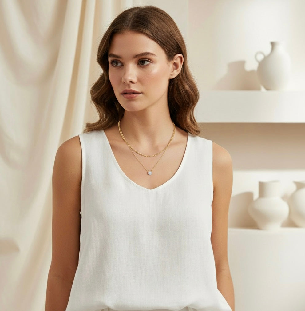 Chic and versatile, this layered gold necklace combines a twisted rope chain with a dainty chain featuring a sparkling crystal pendant. Perfect for adding instant elegance, it’s a stylish piece that works effortlessly with both casual and dressy looks.