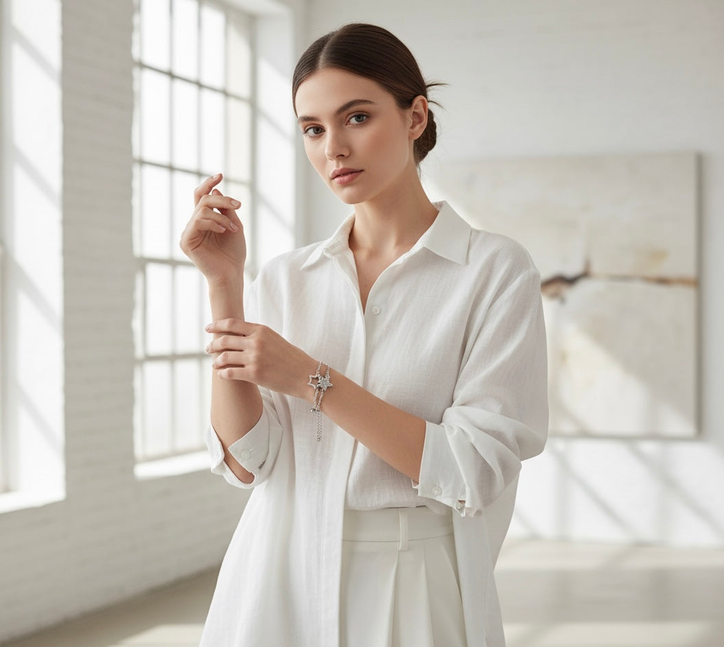 Delicate and dreamy, this silver double chain bracelet features two star charms — one polished and one sparkling with crystals. The layered design and beaded details make it a versatile piece that adds subtle elegance to any outfit.